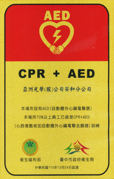 亞洲光學(股)公司安和廠榮獲衛生福利部 CPR 訓練+AED 設立場所認證標章