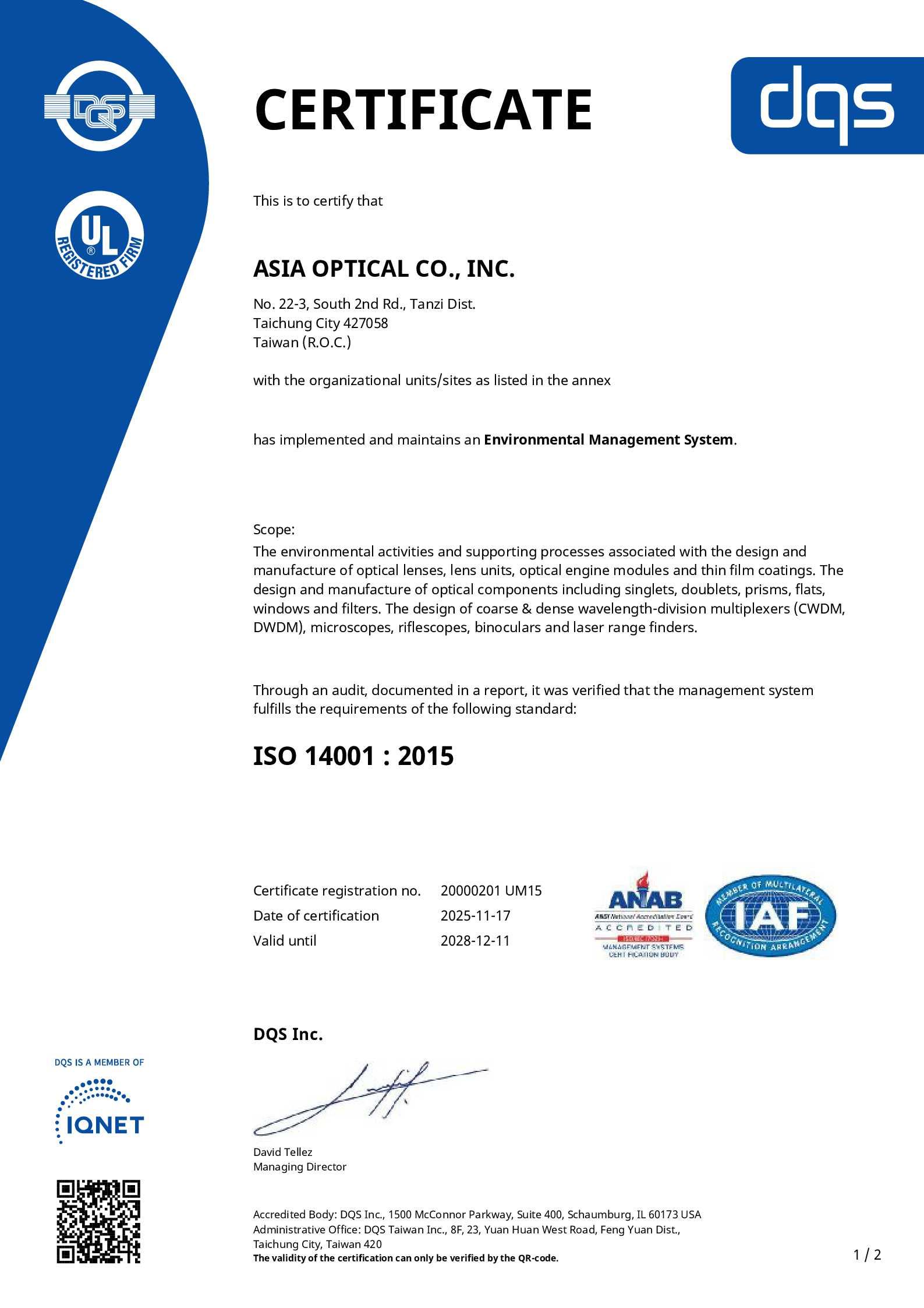 亞光並依據環境法規與其他相關要求事項,徹底落實相關思維與管理改善。以ISO14001為基準,以防止脫離法規與目標的標準值並避免引發環境汙染與意外的風險。